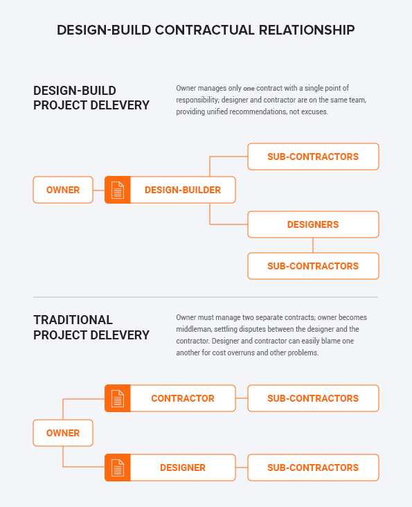 Design-Build is a construction delivery method that provides owners with a single point of contact for both the design and construction phases of a project. One entity holds single-source responsibility and contractual risk for every aspect of a build — from estimation, assessments and pre-construction to architecture, schematics, engineering, subcontracting, construction, and post-construction. This entity, the Design-Builder, manages all contracts with companies, such as subcontractors, equipment vendors and materials providers.